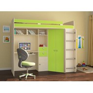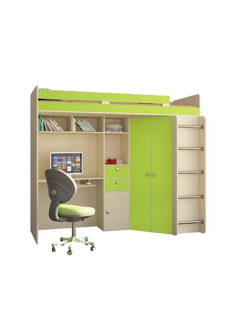 Технические характеристики: Кровать чердак Астра (дуб молочный, салатовый). Умная конструкция кровати-чердака Астра для детской комнаты, которая помогает организовать пространство с максимальной пользой. Вся нижняя зона превращена в многофункциональный блок: с одной стороны — просторный угловой шкаф, с другой — удобное рабочее место с компьютерным столом. Это удачная альтернатива двухъярусной кровати, где первый уровень полностью занят системой хранения и учебной зоной. Кровать на верхнем ярусе с защитными бортиками. Два выдвижных ящика на роликовых направляющих. Максимальная нагрузка на спальное место - 100 кг. Кровать-чердак Астра — это продуманное решение для небольших помещений, где важно совместить спальное место, систему хранения и уголок для учебы без потери комфорта.