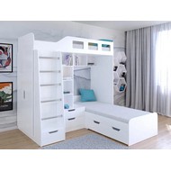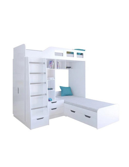 Технические характеристики: Кровать двухъярусная Астра 4 (белый). Кровать двухъярусная Астра 4 - это инновационная модель для двоих детей, отличающаяся эргономичной Г-образной конструкцией. Верхний ярус расположен традиционно, а нижнее спальное место размещено перпендикулярно, что позволяет оптимально использовать угловое пространство комнаты. Верхний ярус с защитными бортиками и лестницей с удобными поручнями. Выдвижной ящик в основании лестницы. Встроенная система хранения: открытые полки в изголовье, два выдвижных ящика, вместительный шкаф для одежды и выкатной ящик под нижним спальным местом. Ящики на роликовых направляющих. Максимальная нагрузка на спальное место - 100 кг. Кровать двухъярусная Астра 4 - это идеальное решение для современных детских комнат, где важны не только комфорт и безопасность, но и рациональная организация пространства.