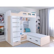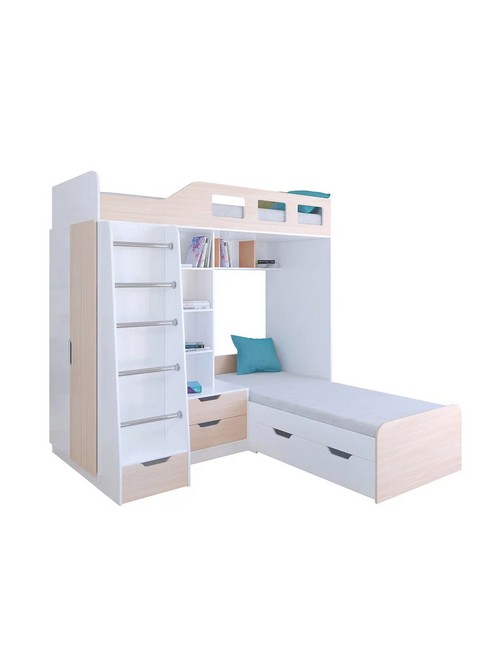 Технические характеристики: Кровать двухъярусная Астра 4 (белый, дуб молочный). Кровать двухъярусная Астра 4 - это инновационная модель для двоих детей, отличающаяся эргономичной Г-образной конструкцией. Верхний ярус расположен традиционно, а нижнее спальное место размещено перпендикулярно, что позволяет оптимально использовать угловое пространство комнаты. Верхний ярус с защитными бортиками и лестницей с удобными поручнями. Выдвижной ящик в основании лестницы. Встроенная система хранения: открытые полки в изголовье, два выдвижных ящика, вместительный шкаф для одежды и выкатной ящик под нижним спальным местом. Ящики на роликовых направляющих. Максимальная нагрузка на спальное место - 100 кг. Кровать двухъярусная Астра 4 - это идеальное решение для современных детских комнат, где важны не только комфорт и безопасность, но и рациональная организация пространства.