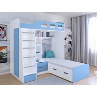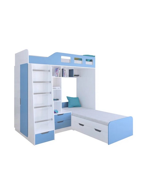 Технические характеристики: Кровать двухъярусная Астра 4 (белый, голубой). Кровать двухъярусная Астра 4 - это инновационная модель для двоих детей, отличающаяся эргономичной Г-образной конструкцией. Верхний ярус расположен традиционно, а нижнее спальное место размещено перпендикулярно, что позволяет оптимально использовать угловое пространство комнаты. Верхний ярус с защитными бортиками и лестницей с удобными поручнями. Выдвижной ящик в основании лестницы. Встроенная система хранения: открытые полки в изголовье, два выдвижных ящика, вместительный шкаф для одежды и выкатной ящик под нижним спальным местом. Ящики на роликовых направляющих. Максимальная нагрузка на спальное место - 100 кг. Кровать двухъярусная Астра 4 - это идеальное решение для современных детских комнат, где важны не только комфорт и безопасность, но и рациональная организация пространства.