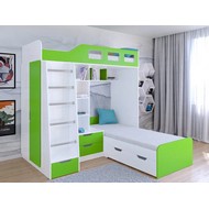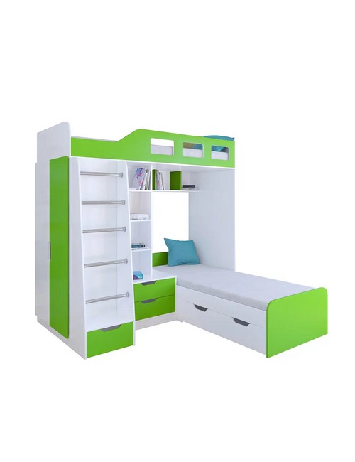 Технические характеристики: Кровать двухъярусная Астра 4 (белый, салатовый). Кровать двухъярусная Астра 4 - это инновационная модель для двоих детей, отличающаяся эргономичной Г-образной конструкцией. Верхний ярус расположен традиционно, а нижнее спальное место размещено перпендикулярно, что позволяет оптимально использовать угловое пространство комнаты. Верхний ярус с защитными бортиками и лестницей с удобными поручнями. Выдвижной ящик в основании лестницы. Встроенная система хранения: открытые полки в изголовье, два выдвижных ящика, вместительный шкаф для одежды и выкатной ящик под нижним спальным местом. Ящики на роликовых направляющих. Максимальная нагрузка на спальное место - 100 кг. Кровать двухъярусная Астра 4 - это идеальное решение для современных детских комнат, где важны не только комфорт и безопасность, но и рациональная организация пространства.