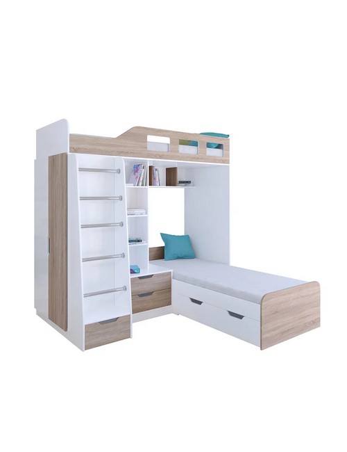Технические характеристики: Кровать двухъярусная Астра 4 (белый, сонома). Кровать двухъярусная Астра 4 - это инновационная модель для двоих детей, отличающаяся эргономичной Г-образной конструкцией. Верхний ярус расположен традиционно, а нижнее спальное место размещено перпендикулярно, что позволяет оптимально использовать угловое пространство комнаты. Верхний ярус с защитными бортиками и лестницей с удобными поручнями. Выдвижной ящик в основании лестницы. Встроенная система хранения: открытые полки в изголовье, два выдвижных ящика, вместительный шкаф для одежды и выкатной ящик под нижним спальным местом. Ящики на роликовых направляющих. Максимальная нагрузка на спальное место - 100 кг. Кровать двухъярусная Астра 4 - это идеальное решение для современных детских комнат, где важны не только комфорт и безопасность, но и рациональная организация пространства.