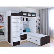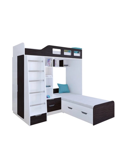 Технические характеристики: Кровать двухъярусная Астра 4 (белый, венге). Кровать двухъярусная Астра 4 - это инновационная модель для двоих детей, отличающаяся эргономичной Г-образной конструкцией. Верхний ярус расположен традиционно, а нижнее спальное место размещено перпендикулярно, что позволяет оптимально использовать угловое пространство комнаты. Верхний ярус с защитными бортиками и лестницей с удобными поручнями. Выдвижной ящик в основании лестницы. Встроенная система хранения: открытые полки в изголовье, два выдвижных ящика, вместительный шкаф для одежды и выкатной ящик под нижним спальным местом. Ящики на роликовых направляющих. Максимальная нагрузка на спальное место - 100 кг. Кровать двухъярусная Астра 4 - это идеальное решение для современных детских комнат, где важны не только комфорт и безопасность, но и рациональная организация пространства.