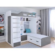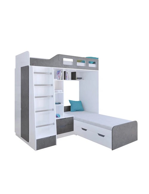 Технические характеристики: Кровать двухъярусная Астра 4 (белый, железный камень). Кровать двухъярусная Астра 4 - это инновационная модель для двоих детей, отличающаяся эргономичной Г-образной конструкцией. Верхний ярус расположен традиционно, а нижнее спальное место размещено перпендикулярно, что позволяет оптимально использовать угловое пространство комнаты. Верхний ярус с защитными бортиками и лестницей с удобными поручнями. Выдвижной ящик в основании лестницы. Встроенная система хранения: открытые полки в изголовье, два выдвижных ящика, вместительный шкаф для одежды и выкатной ящик под нижним спальным местом. Ящики на роликовых направляющих. Максимальная нагрузка на спальное место - 100 кг. Кровать двухъярусная Астра 4 - это идеальное решение для современных детских комнат, где важны не только комфорт и безопасность, но и рациональная организация пространства.