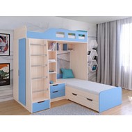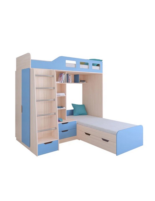 Технические характеристики: Кровать двухъярусная Астра 4 (дуб молочный, голубой). Кровать двухъярусная Астра 4 - это инновационная модель для двоих детей, отличающаяся эргономичной Г-образной конструкцией. Верхний ярус расположен традиционно, а нижнее спальное место размещено перпендикулярно, что позволяет оптимально использовать угловое пространство комнаты. Верхний ярус с защитными бортиками и лестницей с удобными поручнями. Выдвижной ящик в основании лестницы. Встроенная система хранения: открытые полки в изголовье, два выдвижных ящика, вместительный шкаф для одежды и выкатной ящик под нижним спальным местом. Ящики на роликовых направляющих. Максимальная нагрузка на спальное место - 100 кг. Кровать двухъярусная Астра 4 - это идеальное решение для современных детских комнат, где важны не только комфорт и безопасность, но и рациональная организация пространства.