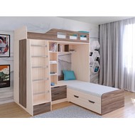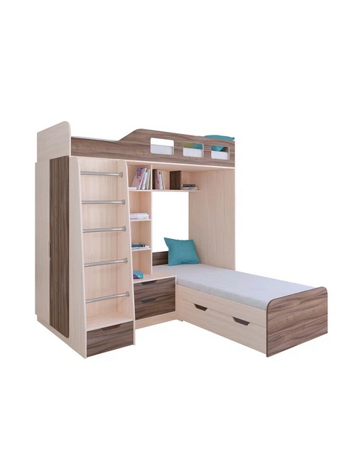 Технические характеристики: Кровать двухъярусная Астра 4 (дуб молочный, орех). Кровать двухъярусная Астра 4 - это инновационная модель для двоих детей, отличающаяся эргономичной Г-образной конструкцией. Верхний ярус расположен традиционно, а нижнее спальное место размещено перпендикулярно, что позволяет оптимально использовать угловое пространство комнаты. Верхний ярус с защитными бортиками и лестницей с удобными поручнями. Выдвижной ящик в основании лестницы. Встроенная система хранения: открытые полки в изголовье, два выдвижных ящика, вместительный шкаф для одежды и выкатной ящик под нижним спальным местом. Ящики на роликовых направляющих. Максимальная нагрузка на спальное место - 100 кг. Кровать двухъярусная Астра 4 - это идеальное решение для современных детских комнат, где важны не только комфорт и безопасность, но и рациональная организация пространства.