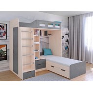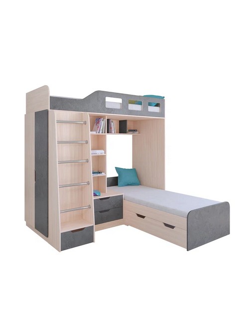 Технические характеристики: Кровать двухъярусная Астра 4 (дуб молочный, железный камень). Кровать двухъярусная Астра 4 - это инновационная модель для двоих детей, отличающаяся эргономичной Г-образной конструкцией. Верхний ярус расположен традиционно, а нижнее спальное место размещено перпендикулярно, что позволяет оптимально использовать угловое пространство комнаты. Верхний ярус с защитными бортиками и лестницей с удобными поручнями. Выдвижной ящик в основании лестницы. Встроенная система хранения: открытые полки в изголовье, два выдвижных ящика, вместительный шкаф для одежды и выкатной ящик под нижним спальным местом. Ящики на роликовых направляющих. Максимальная нагрузка на спальное место - 100 кг. Кровать двухъярусная Астра 4 - это идеальное решение для современных детских комнат, где важны не только комфорт и безопасность, но и рациональная организация пространства.