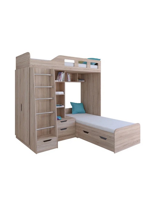 Технические характеристики: Кровать двухъярусная Астра 4 (сонома). Кровать двухъярусная Астра 4 - это инновационная модель для двоих детей, отличающаяся эргономичной Г-образной конструкцией. Верхний ярус расположен традиционно, а нижнее спальное место размещено перпендикулярно, что позволяет оптимально использовать угловое пространство комнаты. Верхний ярус с защитными бортиками и лестницей с удобными поручнями. Выдвижной ящик в основании лестницы. Встроенная система хранения: открытые полки в изголовье, два выдвижных ящика, вместительный шкаф для одежды и выкатной ящик под нижним спальным местом. Ящики на роликовых направляющих. Максимальная нагрузка на спальное место - 100 кг. Кровать двухъярусная Астра 4 - это идеальное решение для современных детских комнат, где важны не только комфорт и безопасность, но и рациональная организация пространства.