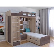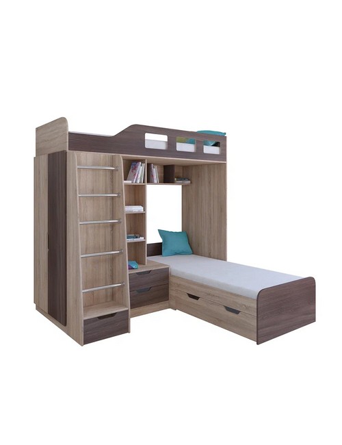 Технические характеристики: Кровать двухъярусная Астра 4 (сонома, дуб шамони). Кровать двухъярусная Астра 4 - это инновационная модель для двоих детей, отличающаяся эргономичной Г-образной конструкцией. Верхний ярус расположен традиционно, а нижнее спальное место размещено перпендикулярно, что позволяет оптимально использовать угловое пространство комнаты. Верхний ярус с защитными бортиками и лестницей с удобными поручнями. Выдвижной ящик в основании лестницы. Встроенная система хранения: открытые полки в изголовье, два выдвижных ящика, вместительный шкаф для одежды и выкатной ящик под нижним спальным местом. Ящики на роликовых направляющих. Максимальная нагрузка на спальное место - 100 кг. Кровать двухъярусная Астра 4 - это идеальное решение для современных детских комнат, где важны не только комфорт и безопасность, но и рациональная организация пространства.