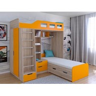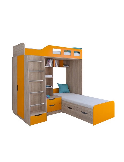 Технические характеристики: Кровать двухъярусная Астра 4 (сонома, оранжевый). Кровать двухъярусная Астра 4 - это инновационная модель для двоих детей, отличающаяся эргономичной Г-образной конструкцией. Верхний ярус расположен традиционно, а нижнее спальное место размещено перпендикулярно, что позволяет оптимально использовать угловое пространство комнаты. Верхний ярус с защитными бортиками и лестницей с удобными поручнями. Выдвижной ящик в основании лестницы. Встроенная система хранения: открытые полки в изголовье, два выдвижных ящика, вместительный шкаф для одежды и выкатной ящик под нижним спальным местом. Ящики на роликовых направляющих. Максимальная нагрузка на спальное место - 100 кг. Кровать двухъярусная Астра 4 - это идеальное решение для современных детских комнат, где важны не только комфорт и безопасность, но и рациональная организация пространства.
