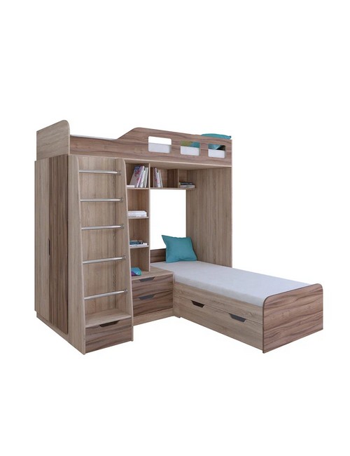 Технические характеристики: Кровать двухъярусная Астра 4 (сонома, орех). Кровать двухъярусная Астра 4 - это инновационная модель для двоих детей, отличающаяся эргономичной Г-образной конструкцией. Верхний ярус расположен традиционно, а нижнее спальное место размещено перпендикулярно, что позволяет оптимально использовать угловое пространство комнаты. Верхний ярус с защитными бортиками и лестницей с удобными поручнями. Выдвижной ящик в основании лестницы. Встроенная система хранения: открытые полки в изголовье, два выдвижных ящика, вместительный шкаф для одежды и выкатной ящик под нижним спальным местом. Ящики на роликовых направляющих. Максимальная нагрузка на спальное место - 100 кг. Кровать двухъярусная Астра 4 - это идеальное решение для современных детских комнат, где важны не только комфорт и безопасность, но и рациональная организация пространства.