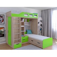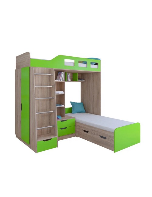 Технические характеристики: Кровать двухъярусная Астра 4 (сонома, салатовый). Кровать двухъярусная Астра 4 - это инновационная модель для двоих детей, отличающаяся эргономичной Г-образной конструкцией. Верхний ярус расположен традиционно, а нижнее спальное место размещено перпендикулярно, что позволяет оптимально использовать угловое пространство комнаты. Верхний ярус с защитными бортиками и лестницей с удобными поручнями. Выдвижной ящик в основании лестницы. Встроенная система хранения: открытые полки в изголовье, два выдвижных ящика, вместительный шкаф для одежды и выкатной ящик под нижним спальным местом. Ящики на роликовых направляющих. Максимальная нагрузка на спальное место - 100 кг. Кровать двухъярусная Астра 4 - это идеальное решение для современных детских комнат, где важны не только комфорт и безопасность, но и рациональная организация пространства.
