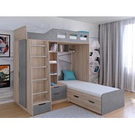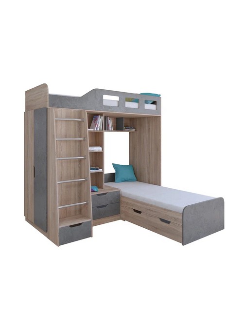 Технические характеристики: Кровать двухъярусная Астра 4 (сонома, железный камень). Кровать двухъярусная Астра 4 - это инновационная модель для двоих детей, отличающаяся эргономичной Г-образной конструкцией. Верхний ярус расположен традиционно, а нижнее спальное место размещено перпендикулярно, что позволяет оптимально использовать угловое пространство комнаты. Верхний ярус с защитными бортиками и лестницей с удобными поручнями. Выдвижной ящик в основании лестницы. Встроенная система хранения: открытые полки в изголовье, два выдвижных ящика, вместительный шкаф для одежды и выкатной ящик под нижним спальным местом. Ящики на роликовых направляющих. Максимальная нагрузка на спальное место - 100 кг. Кровать двухъярусная Астра 4 - это идеальное решение для современных детских комнат, где важны не только комфорт и безопасность, но и рациональная организация пространства.