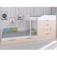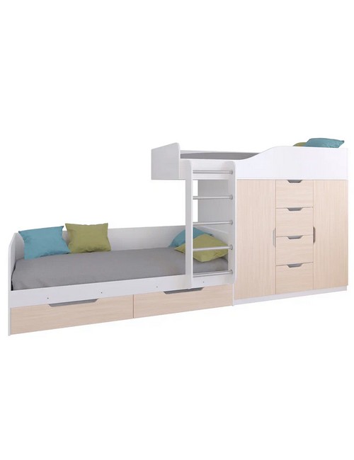 Технические характеристики: Кровать двухъярусная Астра 6 (белый, дуб молочный). Кровать двухъярусная Астра 6 - это современная модель с инновационной планировкой, где спальные места расположены со смещением, что позволяет интегрировать полноценную систему хранения. Конструкция оптимально использует пространство вдоль стены, сочетая комфортные условия для сна и организацию порядка в детской. Встроенный шкаф с индивидуальными секциями для двух пользователей и четыре выдвижных ящика. Удобная лестница для доступа на верхний ярус. Вместительные выдвижные ящики под нижним спальным местом. Нижний ярус может использоваться как диван в дневное время. Направляющие ящиков - роликовые. Максимальная нагрузка на спальное место - 100 кг. Кровать двухъярусная Астра 6 - идеальное решение для организации комфортного личного пространства для двух детей в одной комнате, сочетающее эргономику, функциональность и современный дизайн.