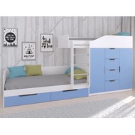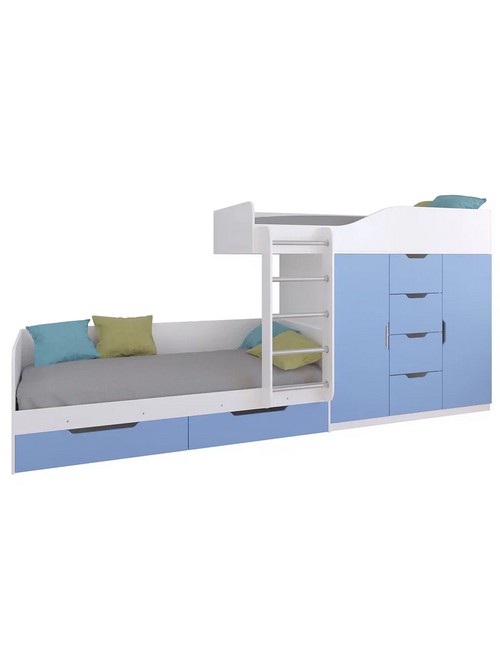 Технические характеристики: Кровать двухъярусная Астра 6 (белый, голубой). Кровать двухъярусная Астра 6 - это современная модель с инновационной планировкой, где спальные места расположены со смещением, что позволяет интегрировать полноценную систему хранения. Конструкция оптимально использует пространство вдоль стены, сочетая комфортные условия для сна и организацию порядка в детской. Встроенный шкаф с индивидуальными секциями для двух пользователей и четыре выдвижных ящика. Удобная лестница для доступа на верхний ярус. Вместительные выдвижные ящики под нижним спальным местом. Нижний ярус может использоваться как диван в дневное время. Направляющие ящиков - роликовые. Максимальная нагрузка на спальное место - 100 кг. Кровать двухъярусная Астра 6 - идеальное решение для организации комфортного личного пространства для двух детей в одной комнате, сочетающее эргономику, функциональность и современный дизайн.