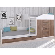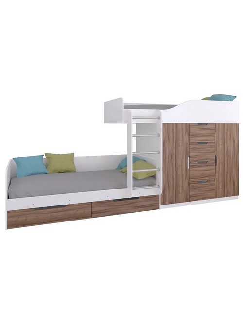 Технические характеристики: Кровать двухъярусная Астра 6 (белый, орех). Кровать двухъярусная Астра 6 - это современная модель с инновационной планировкой, где спальные места расположены со смещением, что позволяет интегрировать полноценную систему хранения. Конструкция оптимально использует пространство вдоль стены, сочетая комфортные условия для сна и организацию порядка в детской. Встроенный шкаф с индивидуальными секциями для двух пользователей и четыре выдвижных ящика. Удобная лестница для доступа на верхний ярус. Вместительные выдвижные ящики под нижним спальным местом. Нижний ярус может использоваться как диван в дневное время. Направляющие ящиков - роликовые. Максимальная нагрузка на спальное место - 100 кг. Кровать двухъярусная Астра 6 - идеальное решение для организации комфортного личного пространства для двух детей в одной комнате, сочетающее эргономику, функциональность и современный дизайн.