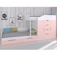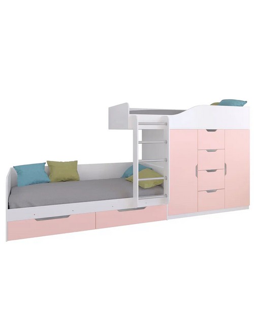 Технические характеристики: Кровать двухъярусная Астра 6 (белый, розовый). Кровать двухъярусная Астра 6 - это современная модель с инновационной планировкой, где спальные места расположены со смещением, что позволяет интегрировать полноценную систему хранения. Конструкция оптимально использует пространство вдоль стены, сочетая комфортные условия для сна и организацию порядка в детской. Встроенный шкаф с индивидуальными секциями для двух пользователей и четыре выдвижных ящика. Удобная лестница для доступа на верхний ярус. Вместительные выдвижные ящики под нижним спальным местом. Нижний ярус может использоваться как диван в дневное время. Направляющие ящиков - роликовые. Максимальная нагрузка на спальное место - 100 кг. Кровать двухъярусная Астра 6 - идеальное решение для организации комфортного личного пространства для двух детей в одной комнате, сочетающее эргономику, функциональность и современный дизайн.
