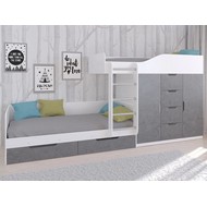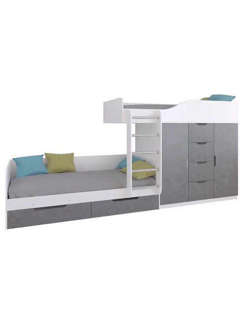 Технические характеристики: Кровать двухъярусная Астра 6 (белый, железный камень). Кровать двухъярусная Астра 6 - это современная модель с инновационной планировкой, где спальные места расположены со смещением, что позволяет интегрировать полноценную систему хранения. Конструкция оптимально использует пространство вдоль стены, сочетая комфортные условия для сна и организацию порядка в детской. Встроенный шкаф с индивидуальными секциями для двух пользователей и четыре выдвижных ящика. Удобная лестница для доступа на верхний ярус. Вместительные выдвижные ящики под нижним спальным местом. Нижний ярус может использоваться как диван в дневное время. Направляющие ящиков - роликовые. Максимальная нагрузка на спальное место - 100 кг. Кровать двухъярусная Астра 6 - идеальное решение для организации комфортного личного пространства для двух детей в одной комнате, сочетающее эргономику, функциональность и современный дизайн.