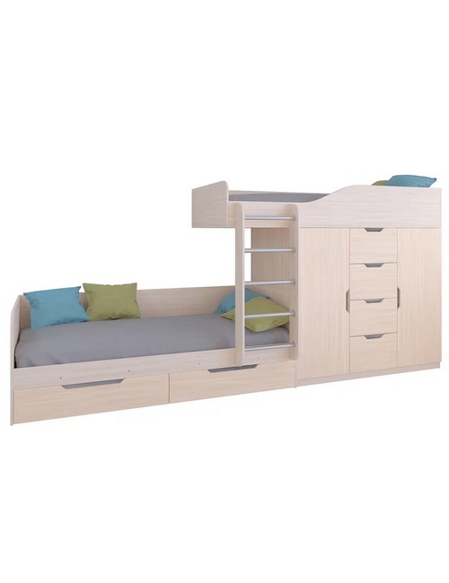 Технические характеристики: Кровать двухъярусная Астра 6 (дуб молочный). Кровать двухъярусная Астра 6 - это современная модель с инновационной планировкой, где спальные места расположены со смещением, что позволяет интегрировать полноценную систему хранения. Конструкция оптимально использует пространство вдоль стены, сочетая комфортные условия для сна и организацию порядка в детской. Встроенный шкаф с индивидуальными секциями для двух пользователей и четыре выдвижных ящика. Удобная лестница для доступа на верхний ярус. Вместительные выдвижные ящики под нижним спальным местом. Нижний ярус может использоваться как диван в дневное время. Направляющие ящиков - роликовые. Максимальная нагрузка на спальное место - 100 кг. Кровать двухъярусная Астра 6 - идеальное решение для организации комфортного личного пространства для двух детей в одной комнате, сочетающее эргономику, функциональность и современный дизайн.