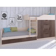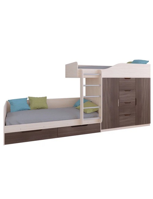 Технические характеристики: Кровать двухъярусная Астра 6 (дуб молочный, дуб шамони). Кровать двухъярусная Астра 6 - это современная модель с инновационной планировкой, где спальные места расположены со смещением, что позволяет интегрировать полноценную систему хранения. Конструкция оптимально использует пространство вдоль стены, сочетая комфортные условия для сна и организацию порядка в детской. Встроенный шкаф с индивидуальными секциями для двух пользователей и четыре выдвижных ящика. Удобная лестница для доступа на верхний ярус. Вместительные выдвижные ящики под нижним спальным местом. Нижний ярус может использоваться как диван в дневное время. Направляющие ящиков - роликовые. Максимальная нагрузка на спальное место - 100 кг. Кровать двухъярусная Астра 6 - идеальное решение для организации комфортного личного пространства для двух детей в одной комнате, сочетающее эргономику, функциональность и современный дизайн.