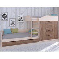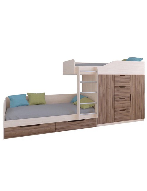 Технические характеристики: Кровать двухъярусная Астра 6 (дуб молочный, орех). Кровать двухъярусная Астра 6 - это современная модель с инновационной планировкой, где спальные места расположены со смещением, что позволяет интегрировать полноценную систему хранения. Конструкция оптимально использует пространство вдоль стены, сочетая комфортные условия для сна и организацию порядка в детской. Встроенный шкаф с индивидуальными секциями для двух пользователей и четыре выдвижных ящика. Удобная лестница для доступа на верхний ярус. Вместительные выдвижные ящики под нижним спальным местом. Нижний ярус может использоваться как диван в дневное время. Направляющие ящиков - роликовые. Максимальная нагрузка на спальное место - 100 кг. Кровать двухъярусная Астра 6 - идеальное решение для организации комфортного личного пространства для двух детей в одной комнате, сочетающее эргономику, функциональность и современный дизайн.