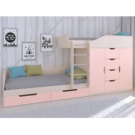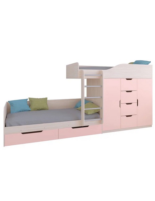 Технические характеристики: Кровать двухъярусная Астра 6 (дуб молочный, розовый). Кровать двухъярусная Астра 6 - это современная модель с инновационной планировкой, где спальные места расположены со смещением, что позволяет интегрировать полноценную систему хранения. Конструкция оптимально использует пространство вдоль стены, сочетая комфортные условия для сна и организацию порядка в детской. Встроенный шкаф с индивидуальными секциями для двух пользователей и четыре выдвижных ящика. Удобная лестница для доступа на верхний ярус. Вместительные выдвижные ящики под нижним спальным местом. Нижний ярус может использоваться как диван в дневное время. Направляющие ящиков - роликовые. Максимальная нагрузка на спальное место - 100 кг. Кровать двухъярусная Астра 6 - идеальное решение для организации комфортного личного пространства для двух детей в одной комнате, сочетающее эргономику, функциональность и современный дизайн.
