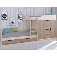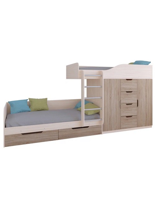 Технические характеристики: Кровать двухъярусная Астра 6 (дуб молочный, сонома). Кровать двухъярусная Астра 6 - это современная модель с инновационной планировкой, где спальные места расположены со смещением, что позволяет интегрировать полноценную систему хранения. Конструкция оптимально использует пространство вдоль стены, сочетая комфортные условия для сна и организацию порядка в детской. Встроенный шкаф с индивидуальными секциями для двух пользователей и четыре выдвижных ящика. Удобная лестница для доступа на верхний ярус. Вместительные выдвижные ящики под нижним спальным местом. Нижний ярус может использоваться как диван в дневное время. Направляющие ящиков - роликовые. Максимальная нагрузка на спальное место - 100 кг. Кровать двухъярусная Астра 6 - идеальное решение для организации комфортного личного пространства для двух детей в одной комнате, сочетающее эргономику, функциональность и современный дизайн.