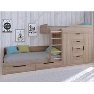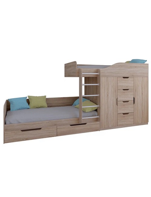 Технические характеристики: Кровать двухъярусная Астра 6 (сонома). Кровать двухъярусная Астра 6 - это современная модель с инновационной планировкой, где спальные места расположены со смещением, что позволяет интегрировать полноценную систему хранения. Конструкция оптимально использует пространство вдоль стены, сочетая комфортные условия для сна и организацию порядка в детской. Встроенный шкаф с индивидуальными секциями для двух пользователей и четыре выдвижных ящика. Удобная лестница для доступа на верхний ярус. Вместительные выдвижные ящики под нижним спальным местом. Нижний ярус может использоваться как диван в дневное время. Направляющие ящиков - роликовые. Максимальная нагрузка на спальное место - 100 кг. Кровать двухъярусная Астра 6 - идеальное решение для организации комфортного личного пространства для двух детей в одной комнате, сочетающее эргономику, функциональность и современный дизайн.