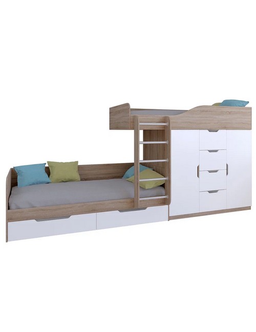 Технические характеристики: Кровать двухъярусная Астра 6 (сонома, белый). Кровать двухъярусная Астра 6 - это современная модель с инновационной планировкой, где спальные места расположены со смещением, что позволяет интегрировать полноценную систему хранения. Конструкция оптимально использует пространство вдоль стены, сочетая комфортные условия для сна и организацию порядка в детской. Встроенный шкаф с индивидуальными секциями для двух пользователей и четыре выдвижных ящика. Удобная лестница для доступа на верхний ярус. Вместительные выдвижные ящики под нижним спальным местом. Нижний ярус может использоваться как диван в дневное время. Направляющие ящиков - роликовые. Максимальная нагрузка на спальное место - 100 кг. Кровать двухъярусная Астра 6 - идеальное решение для организации комфортного личного пространства для двух детей в одной комнате, сочетающее эргономику, функциональность и современный дизайн.