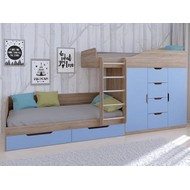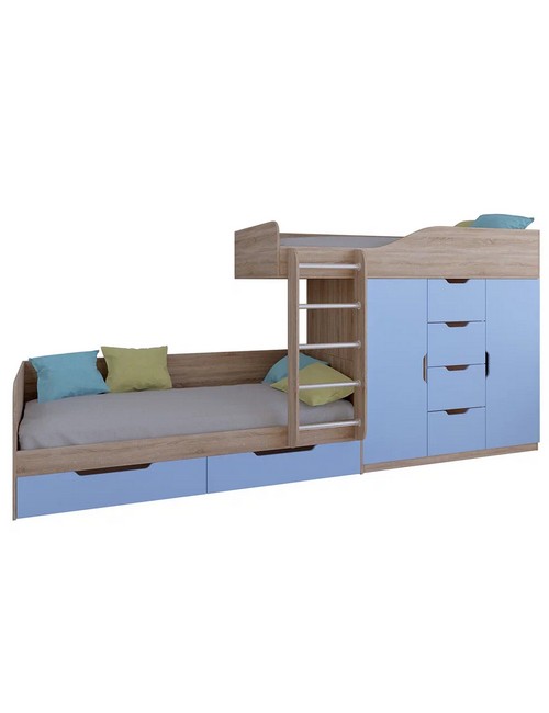 Технические характеристики: Кровать двухъярусная Астра 6 (сонома, голубой). Кровать двухъярусная Астра 6 - это современная модель с инновационной планировкой, где спальные места расположены со смещением, что позволяет интегрировать полноценную систему хранения. Конструкция оптимально использует пространство вдоль стены, сочетая комфортные условия для сна и организацию порядка в детской. Встроенный шкаф с индивидуальными секциями для двух пользователей и четыре выдвижных ящика. Удобная лестница для доступа на верхний ярус. Вместительные выдвижные ящики под нижним спальным местом. Нижний ярус может использоваться как диван в дневное время. Направляющие ящиков - роликовые. Максимальная нагрузка на спальное место - 100 кг. Кровать двухъярусная Астра 6 - идеальное решение для организации комфортного личного пространства для двух детей в одной комнате, сочетающее эргономику, функциональность и современный дизайн.