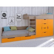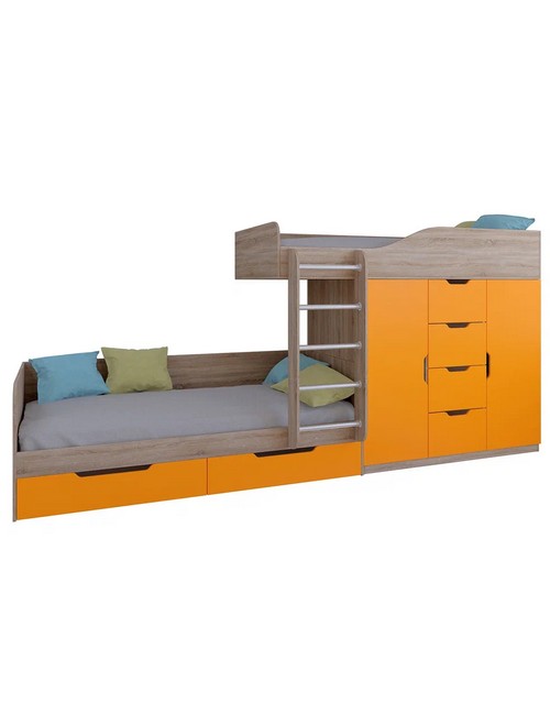 Технические характеристики: Кровать двухъярусная Астра 6 (сонома, оранжевый). Кровать двухъярусная Астра 6 - это современная модель с инновационной планировкой, где спальные места расположены со смещением, что позволяет интегрировать полноценную систему хранения. Конструкция оптимально использует пространство вдоль стены, сочетая комфортные условия для сна и организацию порядка в детской. Встроенный шкаф с индивидуальными секциями для двух пользователей и четыре выдвижных ящика. Удобная лестница для доступа на верхний ярус. Вместительные выдвижные ящики под нижним спальным местом. Нижний ярус может использоваться как диван в дневное время. Направляющие ящиков - роликовые. Максимальная нагрузка на спальное место - 100 кг. Кровать двухъярусная Астра 6 - идеальное решение для организации комфортного личного пространства для двух детей в одной комнате, сочетающее эргономику, функциональность и современный дизайн.