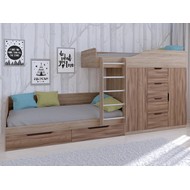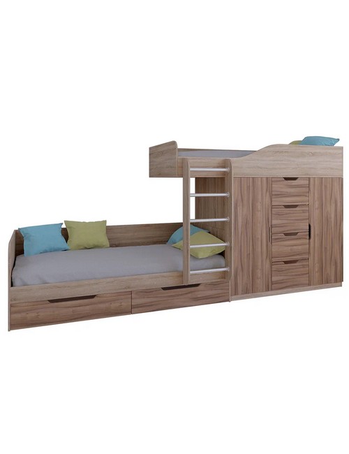 Технические характеристики: Кровать двухъярусная Астра 6 (сонома, орех). Кровать двухъярусная Астра 6 - это современная модель с инновационной планировкой, где спальные места расположены со смещением, что позволяет интегрировать полноценную систему хранения. Конструкция оптимально использует пространство вдоль стены, сочетая комфортные условия для сна и организацию порядка в детской. Встроенный шкаф с индивидуальными секциями для двух пользователей и четыре выдвижных ящика. Удобная лестница для доступа на верхний ярус. Вместительные выдвижные ящики под нижним спальным местом. Нижний ярус может использоваться как диван в дневное время. Направляющие ящиков - роликовые. Максимальная нагрузка на спальное место - 100 кг. Кровать двухъярусная Астра 6 - идеальное решение для организации комфортного личного пространства для двух детей в одной комнате, сочетающее эргономику, функциональность и современный дизайн.