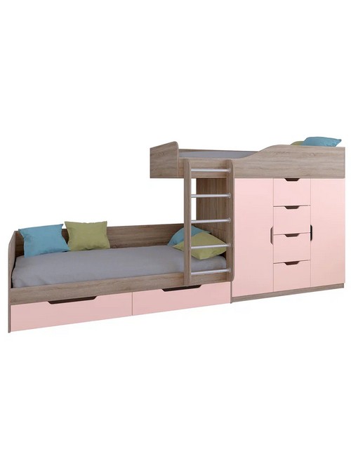 Технические характеристики: Кровать двухъярусная Астра 6 (сонома, розовый). Кровать двухъярусная Астра 6 - это современная модель с инновационной планировкой, где спальные места расположены со смещением, что позволяет интегрировать полноценную систему хранения. Конструкция оптимально использует пространство вдоль стены, сочетая комфортные условия для сна и организацию порядка в детской. Встроенный шкаф с индивидуальными секциями для двух пользователей и четыре выдвижных ящика. Удобная лестница для доступа на верхний ярус. Вместительные выдвижные ящики под нижним спальным местом. Нижний ярус может использоваться как диван в дневное время. Направляющие ящиков - роликовые. Максимальная нагрузка на спальное место - 100 кг. Кровать двухъярусная Астра 6 - идеальное решение для организации комфортного личного пространства для двух детей в одной комнате, сочетающее эргономику, функциональность и современный дизайн.