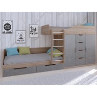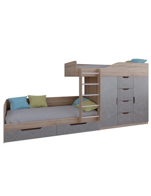 Технические характеристики: Кровать двухъярусная Астра 6 (сонома, железный камень). Кровать двухъярусная Астра 6 - это современная модель с инновационной планировкой, где спальные места расположены со смещением, что позволяет интегрировать полноценную систему хранения. Конструкция оптимально использует пространство вдоль стены, сочетая комфортные условия для сна и организацию порядка в детской. Встроенный шкаф с индивидуальными секциями для двух пользователей и четыре выдвижных ящика. Удобная лестница для доступа на верхний ярус. Вместительные выдвижные ящики под нижним спальным местом. Нижний ярус может использоваться как диван в дневное время. Направляющие ящиков - роликовые. Максимальная нагрузка на спальное место - 100 кг. Кровать двухъярусная Астра 6 - идеальное решение для организации комфортного личного пространства для двух детей в одной комнате, сочетающее эргономику, функциональность и современный дизайн.
