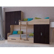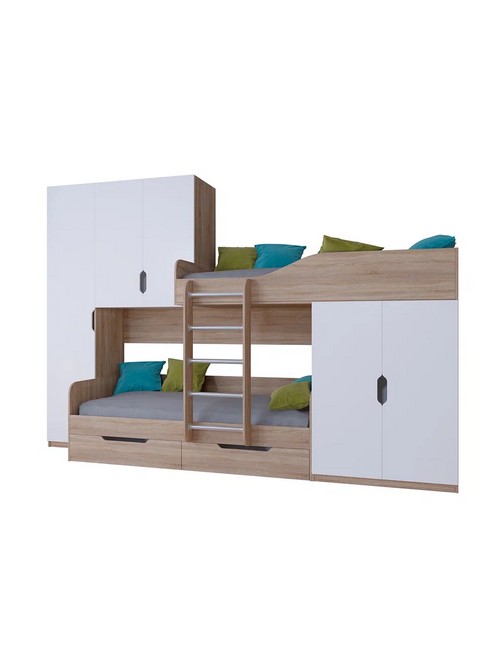Технические характеристики: Кровать двухъярусная Лео (сонома, белый). Кровать двухъярусная Лео - многофункциональный мебельный комплекс для детской комнаты, объединяющий два комфортных спальных места и продуманную систему хранения. Модель эффективно использует пространство вдоль стены, создавая полноценную среду для отдыха, игр и хранения вещей. Вместительный платяной шкаф со штангой и тремя полками, двухстворчатый отдел для хранения у второго яруса, два выдвижных ящика под нижним спальным местом. Безопасные бортики на верхнем ярусе и удобная лестница с металлическими ступенями. Направляющие ящиков - роликовые. Максимальная нагрузка на спальное место - 100 кг. Кровать двухъярусная Лео - идеальное решение для двоих детей, где важна организация личного пространства каждого ребенка и поддержание порядка в комнате. Варианты цвета фасадов: дуб молочный, дуб шамони, орех, оранжевый, голубой, салатовый, розовый, белый, венге, железный камень, сонома. Для уточнения деталей рекомендуем проконсультироваться с нашими специалистами.