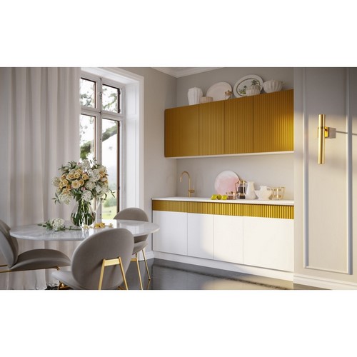 Особенности: Кухня Оливия NEW 2,0м (белый снег софт, горчица софт) - сочетает в себе комфорт и функциональность. Стильный дизайн и высокое качество материалов. Столешница в комплекте. Столешница цельная 240 см - 1шт., толщина - 2,6 см. Универсальная сборка. Регулируемые ножки. Фурнитура без доводчиков на толкателях. Высота нижних модулей указана без учета толщины столешницы. Глубина верхних и нижних модулей указана без учета фасада. Цоколь в комплект не входит.