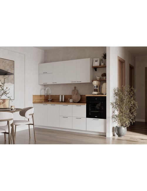 Технические характеристики: Кухонный гарнитур 2550 Лизет (белый). Роскошный кухонный гарнитур с безупречными линиями и гармоничными пропорциями. Благородная палитра оттенков, выразительная текстура дерева и сдержанная эстетика, создающая атмосферу уюта и порядка. Направляющие Firmax с повышенным запасом прочности - свыше 60 000 циклов. Усиленные механизмы, выдерживающие нагрузку более 30 кг. Бесшумная и плавная работа всех движущихся элементов. Встроенная система Push to Open для скрытых ящиков, усиленное дно внутренних модулей для повышенной надежности. Высокий модуль под духовой шкаф для современного зонирования и регулируемые опоры для идеальной устойчивости. Цельная столешница без видимых стыков для простоты ухода, сменные металлические ручки, не требующие пересверливания. В кухонном гарнитуре 2550 коллекции Лизет каждая деталь, от премиальной фурнитуры до бесшовных поверхностей, создает кухню, которая станет не только функциональным пространством, но и источником вдохновения для всей семьи.