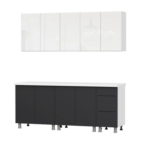 Особенности: Кухонный гарнитур Модерн New 2 метра (белый глянец/графит) без столешницы отличается компактностью наряду с функциональностью. Фасады являются универсальными. Есть возможность отрегулировать опоры по высоте, благодаря чему повышается удобство использования данной мебелью. Данный кухонный гарнитур не укомплектован ручками, но имеет специальную разметку под ручки (межцентровое расстояние 128 мм.). Кухня доступна в качестве модульной системы, благодаря чему вы сможете сконфигурировать мебель соответственно размерам вашего помещения. Обратите внимание, что ручки, толкатели PUSH LATCH, столешница, стеновая панель, а также дополнительное оборудование (мойка, смеситель, бытовая техника) приобретаются отдельно.