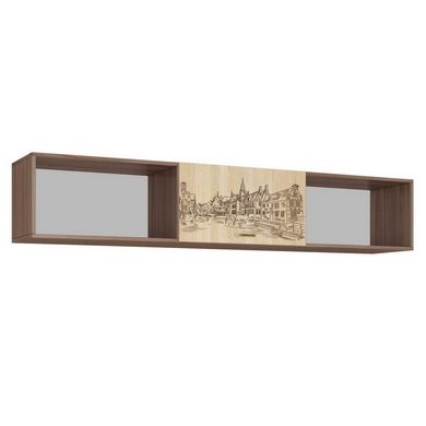 Особенности Навесной секции Орион: Классические цвета исполнения в сочетании с дизайнерскими изображениями городов мира, нанесенными на фасады методом цветной фотопечати. Навесная горизонтальная полка с двумя открытыми нишами и закрытой секцией с дверцей.