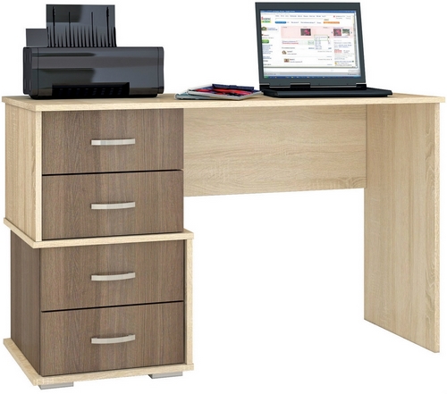 Технические характеристики: Стол оснащён тумбой с четырьмя выдвижными ящиками. Стол можно использовать как письменный или компьютерный. Поставляется в разобранном виде.