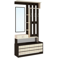 Технические характеристики: Центральная секция состоит из тумбы, вешалки для верхней одежды, полки для головных уборов, стеллажа и зеркала. Вешалка с тремя крючками. Шкаф-пенал оснащён одной полкой и штангой для вешалок. Поставляется в разобранном виде.