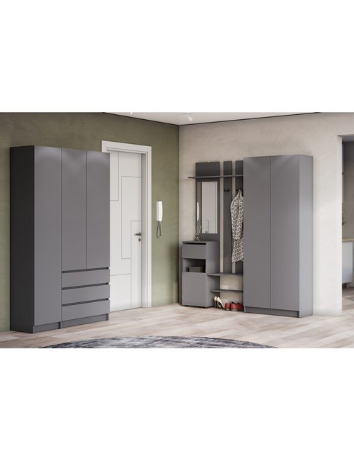 Технические характеристики: Прихожая Бали комплект 10 (графит). Функциональный мебельный гарнитур для прихожей, ориентированный на создание обширной и хорошо организованной системы хранения. Включает вешалку с зеркалом, трехстворчатый и двухстворчатый шкаф. Шкафы оснащены распашными дверцами, а ящики вешалки и трехстворчатого шкафа - роликовыми направляющими. Комплект обеспечивает раздельное хранение для всех категорий вещей: от объемной одежды и обуви до аксессуаров и сезонных предметов, создавая при этом целостную и упорядоченную композицию. Прихожая Бали комплект 10 - это решение для просторных прихожих, где необходима максимальная вместительность и четкая систематизация, воплощенная в сдержанном современном дизайне.