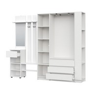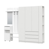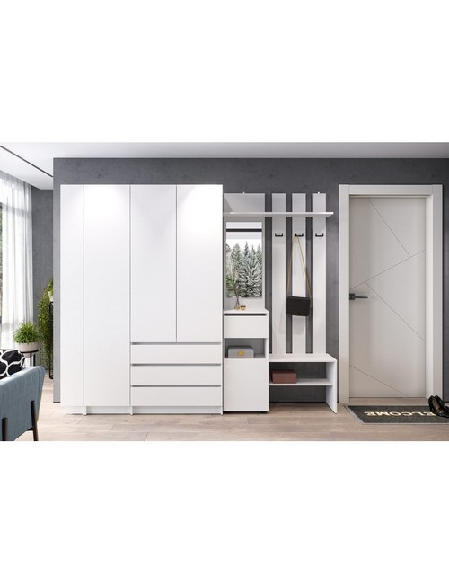 Технические характеристики: Прихожая Бали комплект 13 (белый). Функциональный мебельный гарнитур для прихожей, ориентированный на создание обширной и хорошо организованной системы хранения. Включает вешалку с зеркалом, трехстворчатый шкаф, а также угловое завершение. Шкафы оснащены распашными дверцами, а ящики вешалки и трехстворчатого шкафа - роликовыми направляющими. Комплект обеспечивает раздельное хранение для всех категорий вещей: от объемной одежды и обуви до аксессуаров и сезонных предметов, создавая при этом целостную и упорядоченную композицию. Прихожая Бали комплект 13 - это решение для просторных прихожих, где необходима максимальная вместительность и четкая систематизация, воплощенная в сдержанном современном дизайне.