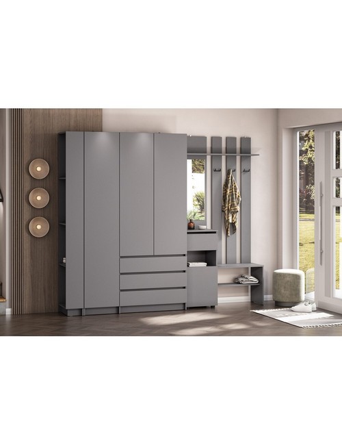 Технические характеристики: Прихожая Бали комплект 13 (графит). Функциональный мебельный гарнитур для прихожей, ориентированный на создание обширной и хорошо организованной системы хранения. Включает вешалку с зеркалом, трехстворчатый шкаф, а также угловое завершение. Шкафы оснащены распашными дверцами, а ящики вешалки и трехстворчатого шкафа - роликовыми направляющими. Комплект обеспечивает раздельное хранение для всех категорий вещей: от объемной одежды и обуви до аксессуаров и сезонных предметов, создавая при этом целостную и упорядоченную композицию. Прихожая Бали комплект 13 - это решение для просторных прихожих, где необходима максимальная вместительность и четкая систематизация, воплощенная в сдержанном современном дизайне.