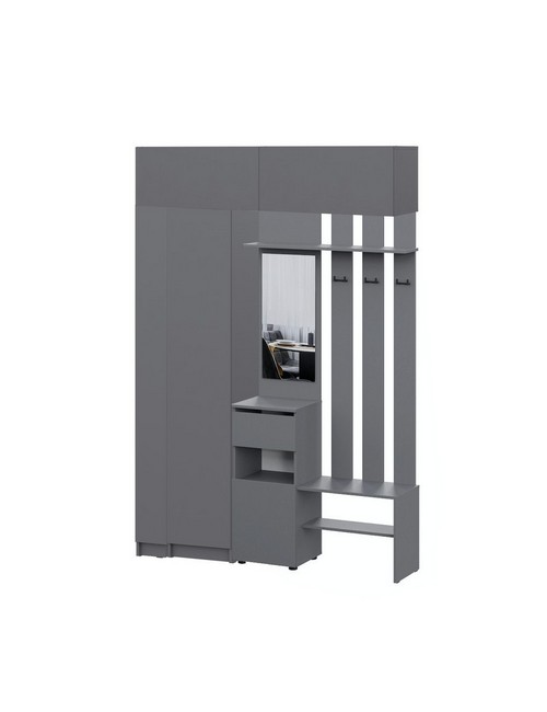 Технические характеристики: Прихожая Бали комплект 15 (графит). Функциональный мебельный ансамбль для прихожей, создающий упорядоченное и стильное пространство с системой хранения. В комплектацию входит: вертикальный пенал для хранения, вешалка с зеркалом для ежедневного использования, угловой элемент для рационального использования пространства и два верхних шкафа для сезонных вещей. Ящики на роликовых направляющих. Набор предлагает полную организацию прихожей: от размещения верхней одежды и обуви до хранения аксессуаров и демонстрации декора, сохраняя ощущение легкости благодаря своему цвету и модульной конструкции. Прихожая Бали комплект 15 - это готовое решение для создания гармоничного и практичного интерьера, идеально подходящее для современных квартир, где ценится порядок и эргономика.