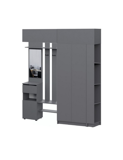 Технические характеристики: Прихожая Бали комплект 23 (графит). Сбалансированный мебельный ансамбль для прихожей, создающий функциональную зону с акцентом на навесное хранение. Включает вешалку с зеркалом, двухстворчатый шкаф, два широких навесных модуля и угловой элемент. Шкафы оснащены распашными дверцами, а ящики вешалки — роликовыми направляющими для удобного доступа. Комплект позволяет эффективно распределить верхнюю одежду и обувь в нижней зоне, разместить сезонные или редко используемые вещи наверху и рационально использовать угол, создавая при этом визуально легкую и упорядоченную композицию. Прихожая Бали комплект 23 — это практичное решение для современного интерьера, идеально подходящее для тех, кто ценит четкую организацию, модульность и лаконичный дизайн.