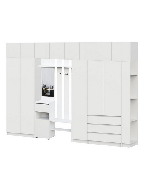 Технические характеристики: Прихожая Бали комплект 25 (белый). Продуманный мебельный гарнитур для прихожей, эффективно использующий угловое и вертикальное пространство для системного хранения. Включает вешалку с зеркалом, угловой элемент, двухстворчатый и трехстворчатый шкафы, а также четыре навесных модуля. Шкафы оснащены распашными дверцами, а ящики вешалки и трехстворчатого шкафа — роликовыми направляющими. Комплект позволяет организовать раздельное хранение одежды, обуви, сумок и сезонных аксессуаров, создавая законченную и упорядоченную композицию благодаря угловому решению и модульности. Прихожая Бали комплект 25 — это идеальный выбор для тех, кто ценит глубокую функциональность, четкую организацию пространства и лаконичный современный дизайн в едином стиле.