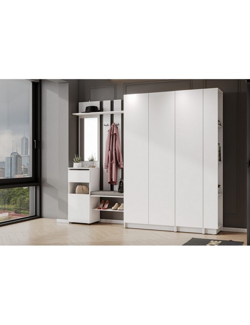 Технические характеристики: Прихожая Бали комплект 4 (белый). Функциональный мебельный гарнитур для прихожей, ориентированный на создание обширной и хорошо организованной системы хранения. Включает вешалку с зеркалом, двухстворчатый шкаф, пенал, а также угловое завершение. Шкафы оснащены распашными дверцами, а ящики вешалки - роликовыми направляющими. Комплект обеспечивает раздельное хранение для всех категорий вещей: от объемной одежды и обуви до аксессуаров и сезонных предметов, создавая при этом целостную и упорядоченную композицию. Прихожая Бали комплект 4 - это решение для просторных прихожих, где необходима максимальная вместительность и четкая систематизация, воплощенная в сдержанном современном дизайне.