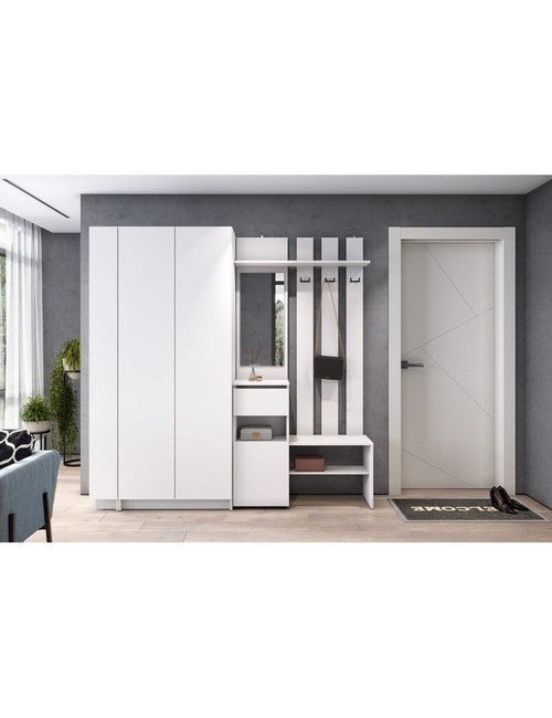 Технические характеристики: Прихожая Бали комплект 9 (белый). Функциональный мебельный гарнитур для прихожей, ориентированный на создание обширной и хорошо организованной системы хранения. Включает вешалку с зеркалом, двухстворчатый шкаф, а также угловое завершение. Шкафы оснащены распашными дверцами, а ящики вешалки и шкафа - роликовыми направляющими. Комплект обеспечивает раздельное хранение для всех категорий вещей: от объемной одежды и обуви до аксессуаров и сезонных предметов, создавая при этом целостную и упорядоченную композицию. Прихожая Бали комплект 9 - это решение для просторных прихожих, где необходима максимальная вместительность и четкая систематизация, воплощенная в сдержанном современном дизайне.