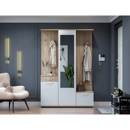 Технические характеристики: Готовая прихожая ПР 1 с зеркальным фасадом. Выдвижной ящик на роликовых направляющих, комплект полок, открытая вешалка. Сборка не универсальная. Максимальная нагрузка на полки - 5 кг. Зеркало в комплекте. Петли на фасадах без доводчиков.